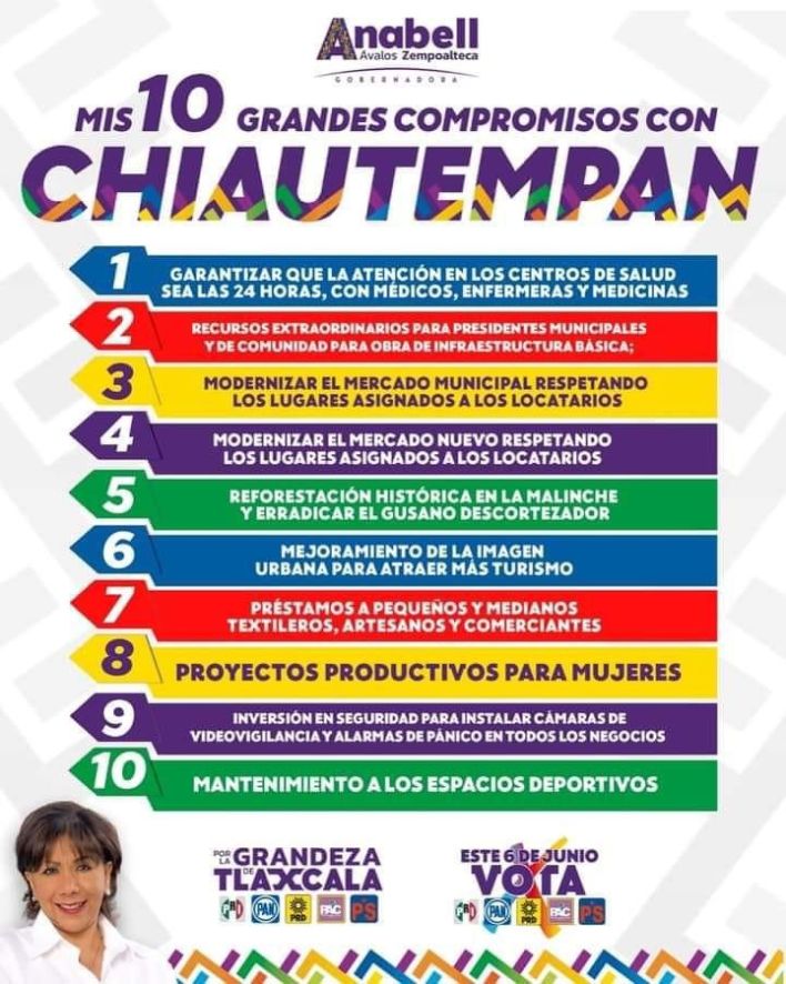 Al iniciar la segunda vuelta al estado, la abanderada de la coalición PRI, PAN, PRD, PAC y PS a la gubernatura de Tlaxcala, Anabell Ávalos Zempoalteca, firmó sus 10 grandes compromisos con el municipio de Chiautempan en materia de seguridad, salud, obra pública y ecología.