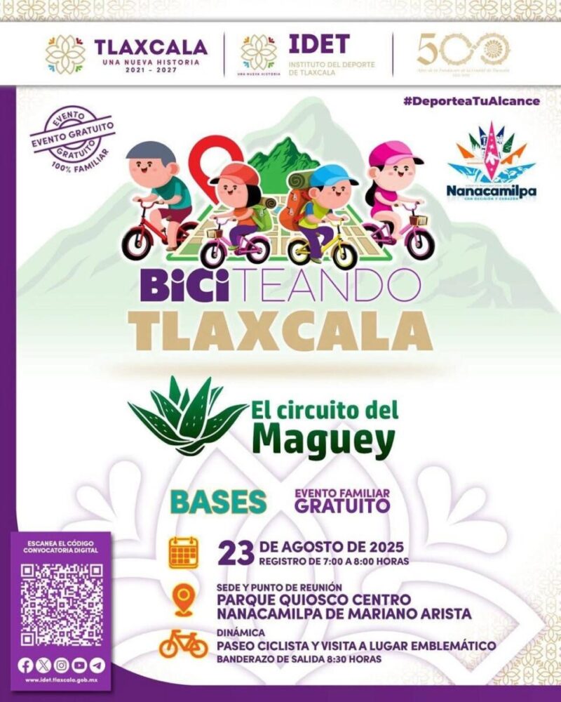 El Instituto del Deporte de Tlaxcala (IDET) lanzó una invitación abierta a ciclistas, público en general y niños a partir de 10 años para participar en el programa “Biciteando por Tlaxcala: El Circuito del Maguey”, que se llevará a cabo el próximo 23 de agosto en Nanacamilpa.