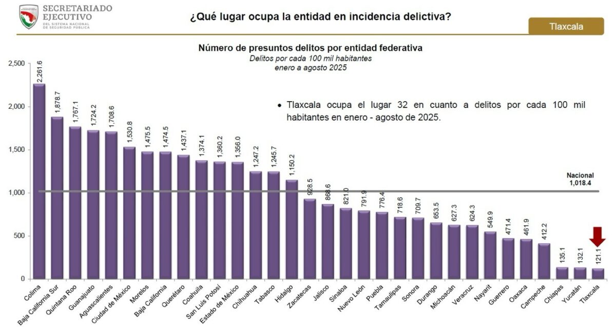 Tlaxcala se consolidó como la entidad más segura de México en los primeros ocho meses de 2025, al registrar la menor incidencia delictiva nacional con una tasa de 121.1 delitos por cada 100 mil habitantes, de acuerdo con el más reciente informe del Secretariado Ejecutivo del Sistema Nacional de Seguridad Pública (SESNSP). El reporte confirma además que delitos como homicidio doloso, feminicidio y robos muestran una tendencia sostenida a la baja.