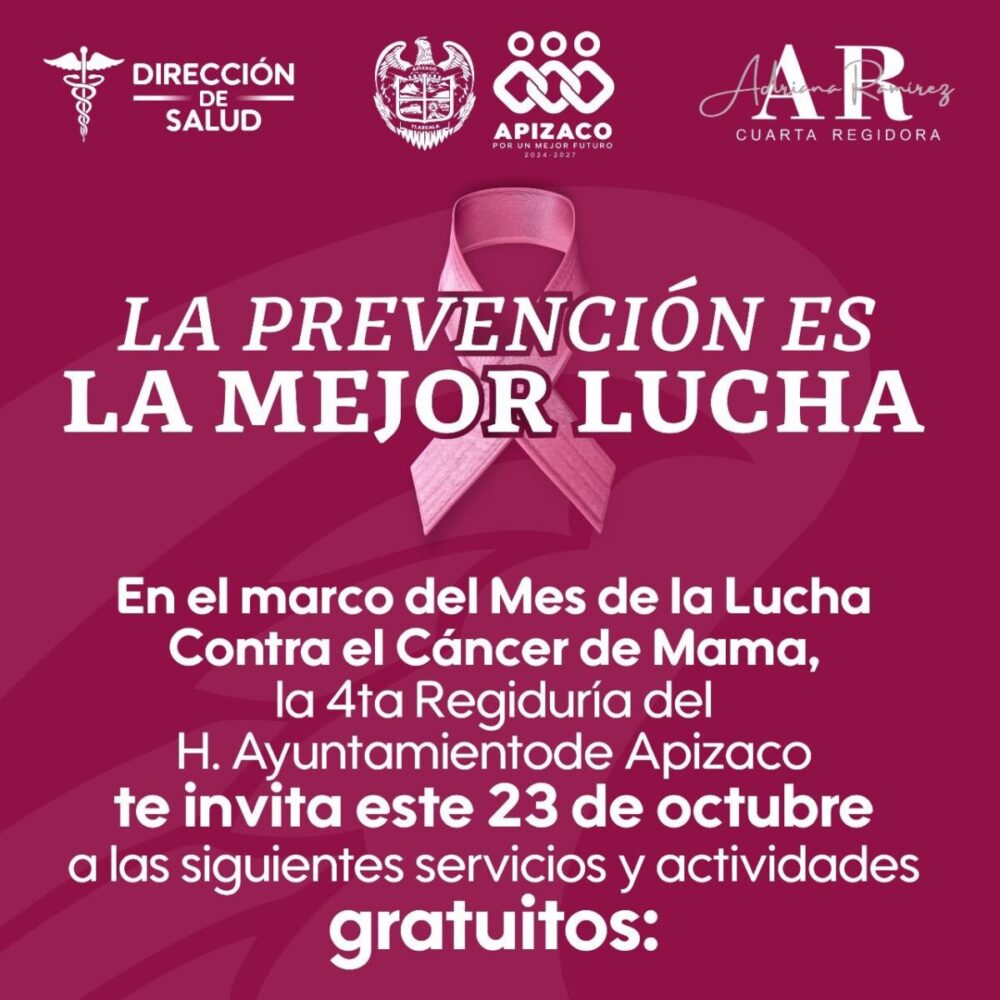 El Ayuntamiento de Apizaco, en coordinación con la Cuarta Regiduría encabezada por Adriana Eugenia Ramírez Franco, convoca a la población a participar en esta jornada de bienestar bajo el lema “La prevención es la mejor lucha”, con acciones enfocadas en la detección temprana y la promoción de hábitos saludables.