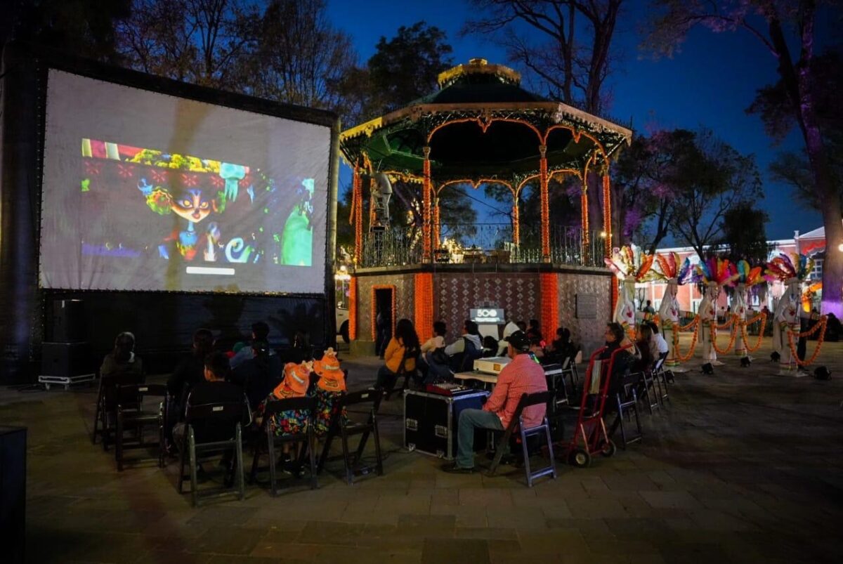 Más tarde, la Plaza de la Constitución se convirtió en una sala de cine al aire libre con la proyección de la película “El Libro de la Vida”, que reunió a familias completas en un ambiente de unión y respeto por las tradiciones del Día de Muertos.