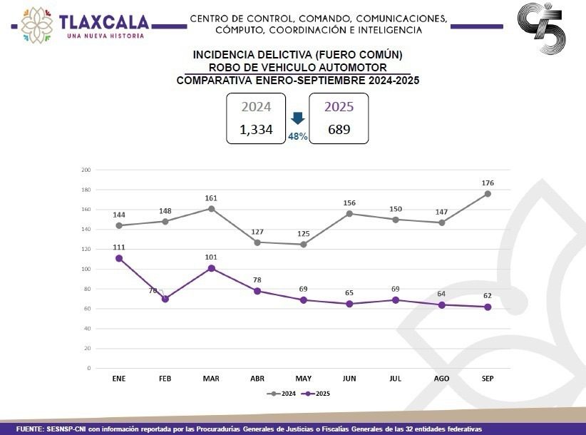 En lo que va de 2025, el delito de robo de vehículo automotor registra una tendencia a la baja en el estado de Tlaxcala, con una reducción del 48% respecto al mismo periodo de 2024. Este avance se atribuye a la inversión histórica en equipamiento, tecnología e infraestructura, así como a la coordinación interinstitucional entre los distintos niveles de gobierno.