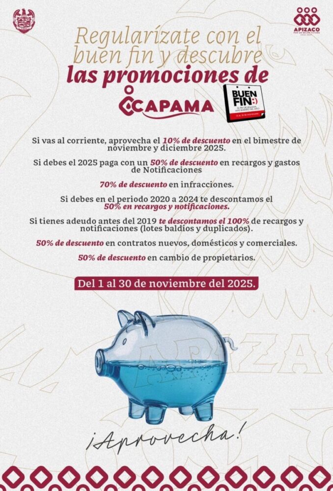 El Ayuntamiento de Apizaco anunció dos campañas de descuentos para apoyar la economía familiar y fomentar el cumplimiento responsable de los usuarios del servicio de agua potable. Las promociones estarán disponibles del 1 de noviembre de 2025 al 28 de febrero de 2026.
