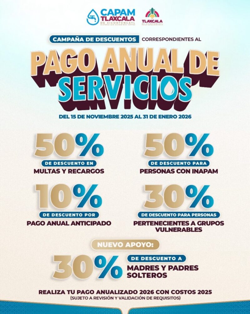 Para mayores informes, los interesados pueden acudir a las oficinas de la CAPAM, ubicadas en Calle 20 de Noviembre 46-A, en el centro de la ciudad de Tlaxcala, o consultar los horarios de atención mediante “Xicoh”, el asistente virtual del Ayuntamiento, disponible en WhatsApp al 246 221 99 14.