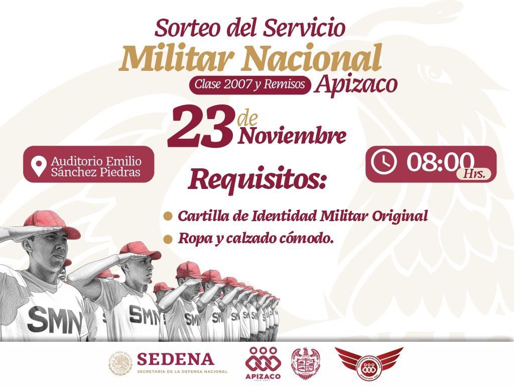 El Gobierno Municipal de Apizaco informó que el sorteo del Servicio Militar Nacional 2025, dirigido a jóvenes de la clase 2007 y remisos que tramitaron su cartilla durante este año, se llevará a cabo el 23 de noviembre de 2025 a las 08:00 horas en el Auditorio Emilio Sánchez Piedras, en cumplimiento a las disposiciones de la Secretaría de la Defensa Nacional (Sedena) y de la 23/a Zona Militar.