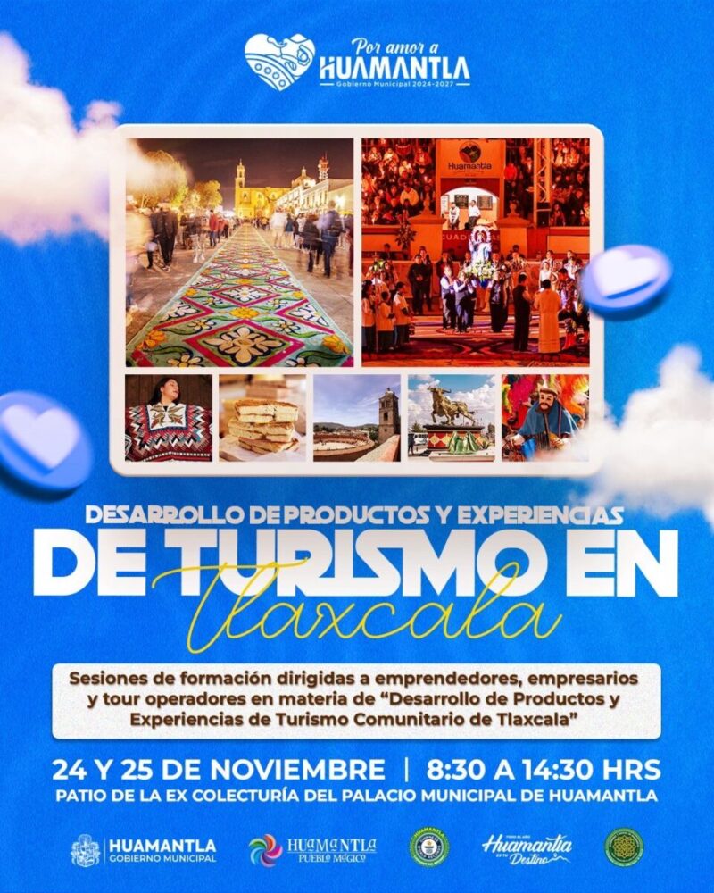 Las sesiones se llevarán a cabo los días 24 y 25 de noviembre, de 08:30 a 14:30 horas, en el patio de la Ex Colecturía del Palacio Municipal de Huamantla. Durante las actividades se abordarán metodologías y buenas prácticas para la creación de productos turísticos innovadores, sostenibles y vinculados al territorio.