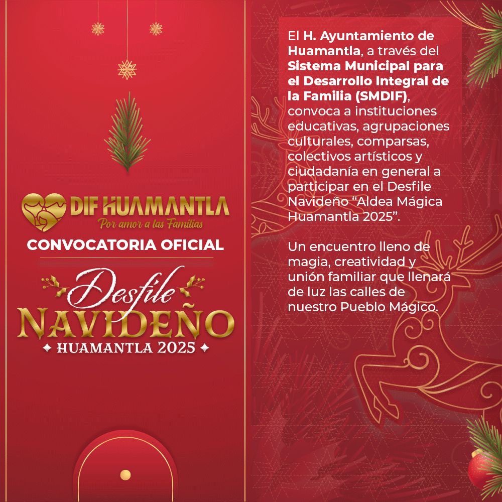 El SMDIF de Huamantla mantiene abierta la convocatoria para participar en el Desfile Navideño de la Quinta Edición de Aldea Mágica 2025, programado para el sábado 6 de diciembre, con el objetivo de promover tradiciones locales, creatividad e identidad cultural, además de atraer turismo.