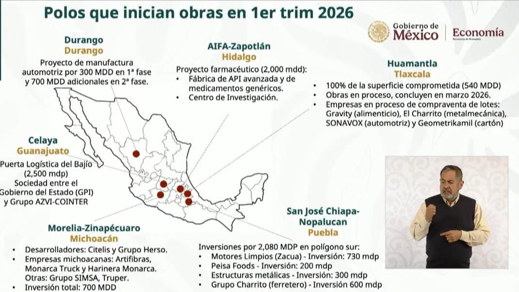 Durante La Mañanera del Pueblo, encabezada por la presidenta Claudia Sheinbaum Pardo, Ebrard informó que el polo ubicado en Huamantla tiene comprometido el 100 por ciento de su superficie, con una inversión estimada de 540 millones de dólares, lo que fortalece la posición del estado como punto estratégico para la atracción de capital productivo y generación de empleos.