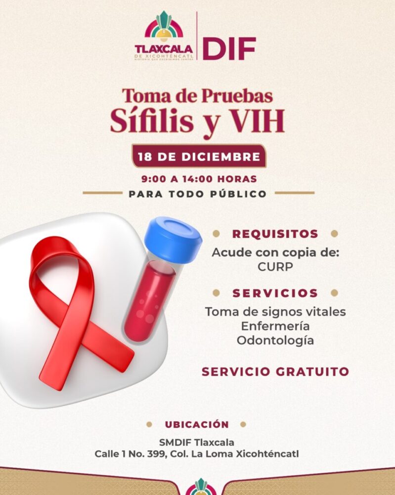 El Ayuntamiento de Tlaxcala anunció que el jueves 18 de diciembre se realizará una jornada gratuita de detección de VIH y sífilis, con el propósito de fortalecer la prevención y facilitar el acceso a servicios de salud para la población.