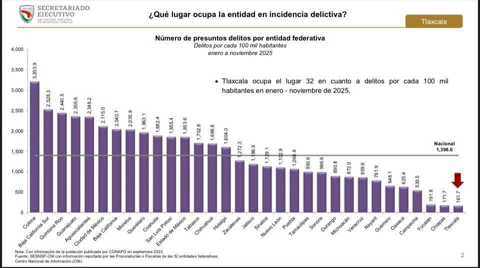 Durante noviembre, Tlaxcala ocupó el lugar 31 a nivel nacional en incidencia delictiva por cada 100 mil habitantes, con 11.4 casos. En el acumulado de enero a noviembre de 2025, la entidad se posicionó en el sitio 32, con 161.5 delitos por cada 100 mil habitantes, la cifra más baja del país.