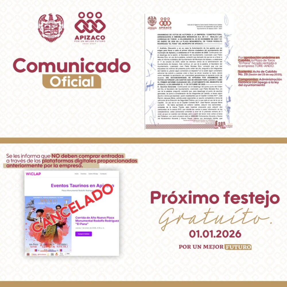 El Gobierno de Apizaco informó que asumirá la organización del tradicional festejo del Primero de Enero, luego de que la empresa TORE-ANDO, arrendataria de la Plaza de Toros Monumental Rodolfo Rodríguez “El Pana”, canceló por causas de fuerza mayor el evento programado para el 1 de enero de 2026.