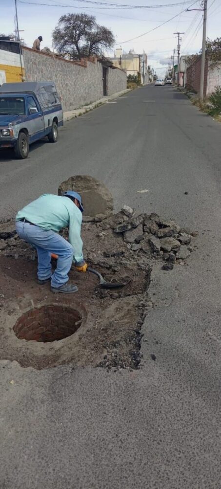 Asimismo, se realizaron trabajos de bacheo en Privada de Juárez y el cambio de brocal, contribuyendo a la seguridad vial y al adecuado funcionamiento de la infraestructura hidráulica.