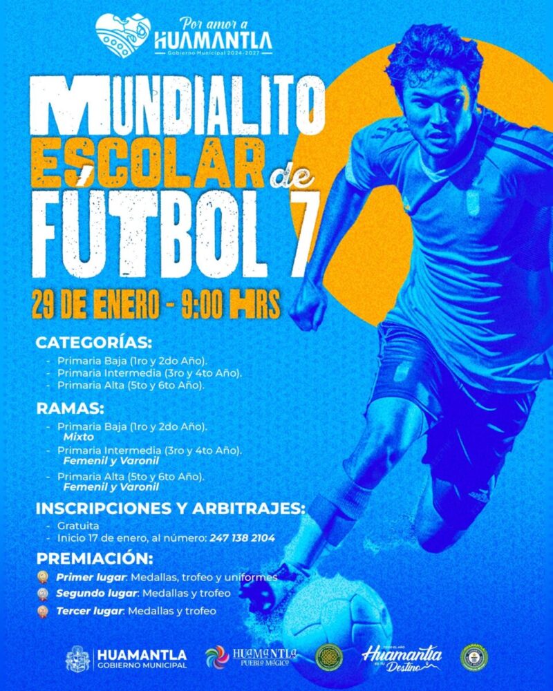 El Gobierno Municipal de Huamantla llamó a escuelas primarias del municipio y de localidades vecinas a participar en el “Mundialito Escolar de Fútbol 7”, un torneo gratuito que busca fomentar la actividad física, la convivencia y los valores entre niñas y niños.