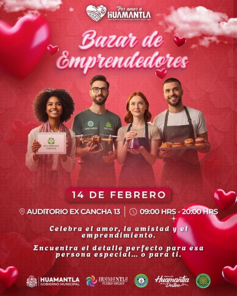 Con el propósito de fortalecer la economía local y ofrecer un espacio de promoción para emprendedores huamantlecos, el Gobierno Municipal de Huamantla, a través de la Coordinación de Desarrollo Económico, realizará el Bazar “Entre Amigos y Corazones” este 14 de febrero.