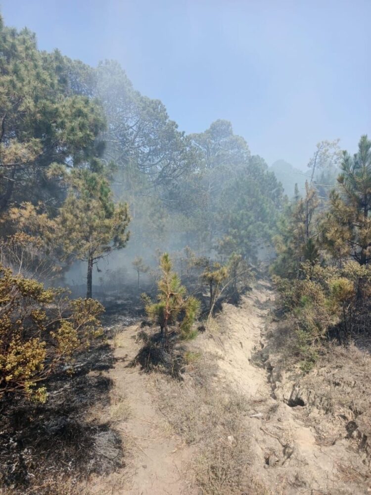 Al arribar al lugar, el personal constató la presencia de fuego que consumía pastizal, arbustos y residuos de pino. De inmediato se iniciaron las labores correspondientes para contener las llamas y evitar su propagación hacia áreas aledañas, particularmente por tratarse de una zona cercana a barrancas y vegetación natural.
